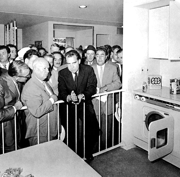 1959年7月,美国副总统理查德·尼克松到莫斯科为美国的一个展会开张剪彩。这个展会主要展示了美国在科技研发和物质建设方面所取得的成就,其中的一个亮点就是专门复制了一个样板房,陈列美国普通工人家居的全貌:地上铺满了地毯,客厅里摆放了电视机,有两个厕所,装有中央取暖器,厨房里还有洗衣机、滚筒式烘干机和冰箱。