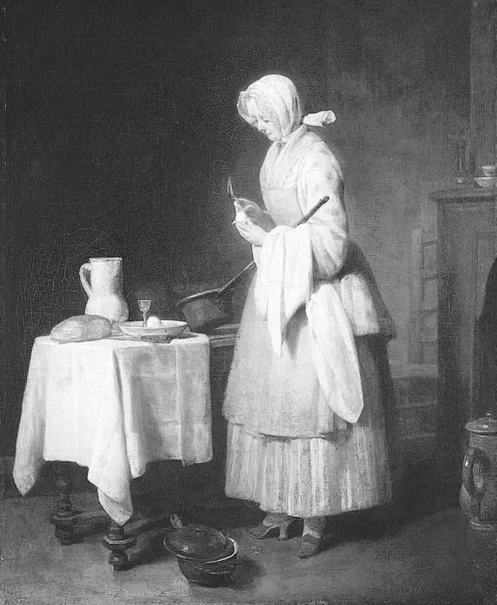 让巴蒂斯特·夏尔丹(Jean-Baptiste-Siméon Chardin(1669—1779):法国静物和家庭景物画家。在他的风俗画中,他所画的家庭主妇纯朴,但是衣服整洁,他们的居室也同样干净利落。画面使人产生亲切与和美的感觉。——译者)在1746年画了一幅画《病人的膳食》。一位衣着朴素的妇人站在一间家具简陋的屋子里,充满耐心地为一个我们在画面上看不见的病人剥鸡蛋。这是普通人生活中极为普通的一刻。为什么要选这些东西来作为绘画素材呢?就他的大多数作品而言,批评家一致认为很难就选材的原因进行回答。他是一位天才的画家,经常神秘莫测地投入很大的精力来画面包片、破碎的盘子、刀叉、苹果和梨,或劳动阶层和下层民众在简陋的厨房或客厅在做他们各自事情的情景。