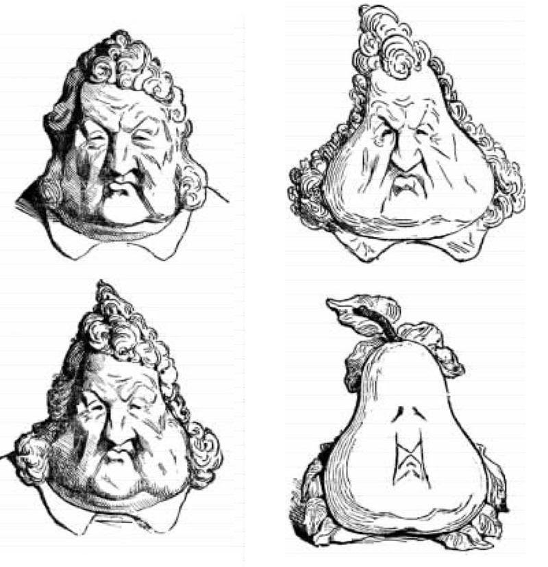但此时发生了一件事,给路易·菲力普宁静的心情蒙上了一丝阴影。1830年末,一个28岁的不知名的艺术家夏尔·菲利蓬创办了一份讽刺杂志《漫画》,在杂志上他把国王的头画成一只梨的形状,他认为国王是大范围的腐败和无能的源头。菲利蓬的漫画不仅极不友好地影射了国王臃肿的脸颊和球茎一样的额头,而且法语中“poire”(梨)的意思是蠢货或傻瓜,他用这个词语巧妙地表达了对路易·菲力普统治政府的远非尊敬的态度。