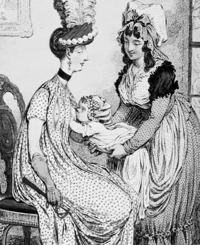 在同一时候,母乳喂养突然间在上层社会的妇女中流行起来,她们虽然以前从来都不关心婴儿的哺育,但现在开始给婴儿喂奶,使自己与为母之道的最进步的潮流相符合。这些几乎都找不到育婴室的女人一再要求袒露她们的乳房,而且往往是在吃午饭或晚饭的过程中。漫画家们又一次介入了,呼吁人们要把握分寸。