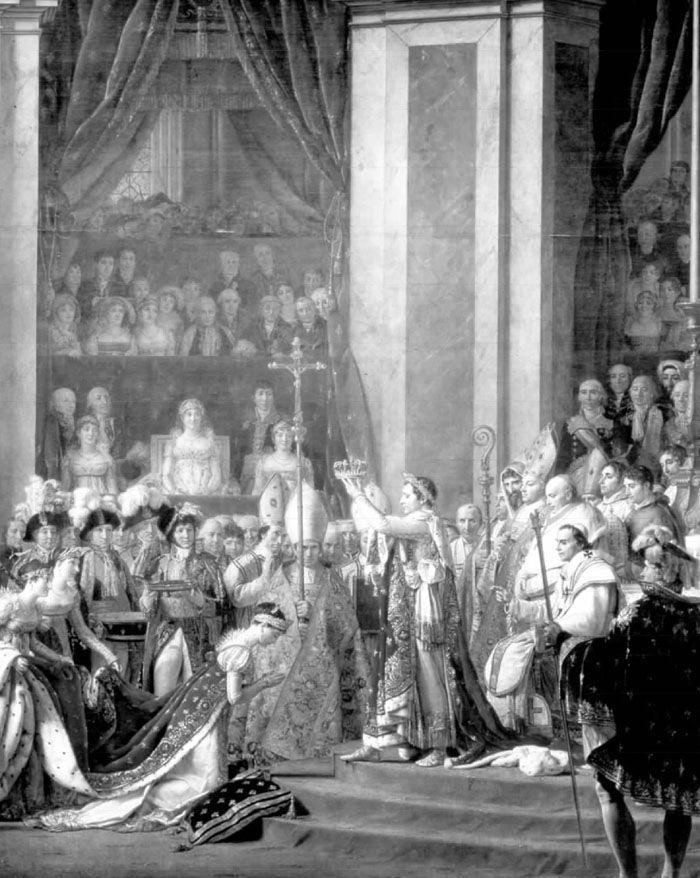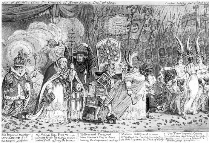 在30年以前,拿破仑·波拿巴,这位欧洲最有权势的人,在幽默感面前显得同样易受伤害。1799年上台执政起,他下令关闭巴黎所有的讽刺报纸,并告诉他的警察总长约瑟夫·富歇,他绝对不能容忍漫画家拿他的相貌开涮。他更倾向于把自己的容貌留给雅克路易·大卫来绘画。他请这位伟大的画家为他做一幅自己威风凛凛地骑在马上,率军通过阿尔卑斯山口的画。这幅画就是《拿破仑穿过圣伯纳德山口》(1801),拿破仑对此非常满意,因此他又去请他为自己画一幅他一生中最辉煌时刻的画,即1804年12月他在巴黎圣母院的加冕典礼。这是一个盛况空前的时刻。法国王公贵族齐聚此地,庇护七世教皇也前来观礼,欧洲各国使节都前来道贺,让弗朗索瓦·勒叙厄为此次典礼专门谱制了音乐。