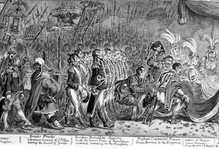 画上是一个狂妄自大、臃肿不堪、高视阔步的皇帝,带领着一群献媚者、马屁精和囚犯。庇护七世教皇虽然也在场,但同大卫的版本不同,吉尔雷笔下的教皇在袍子下面揣着一个唱诗班的男孩,那男孩正在摘下面具,露出一张魔鬼的脸。约瑟芬,绝对不同于大卫笔下的清新秀丽的美女,是一个满脸痤疮、胖如气球的女人。后边捧着皇帝拖地长袍的是拿破仑征服的国家——普鲁士、西班牙和荷兰——的使臣。他们看起来并非心甘情愿地干这件事。他们身后是两排戴着手铐的士兵:这不是一个老百姓愿意拥戴的皇帝。维持士兵秩序的是警察总长约瑟夫·富歇,如同吉尔雷在说明词中解释的那样,他“高举正义之剑”,剑上血迹斑斑。