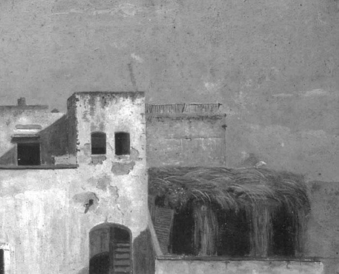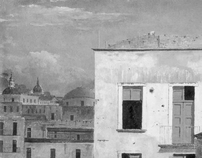 琼斯给我们展示了这一情景:在南方相互连接的墙壁上,强烈的光线照亮了因风吹雨打而变得斑斑驳驳的灰泥,光线勾勒出每一块凹陷的、残缺的地方,就像渔夫饱经风霜的粗糙的双手一样,可以唤起我们对时光流逝的感慨;四季流转,一刻不停,单调沉寂的夏季炎热让位于狂怒的冬季暴风雨,经过了一段似乎没完没了的时间,冬季的暴风雨也会被试探性的春季阳光所替代。琼斯画笔下的石头和灰泥充分地体现出了黏土、石灰和地中海山坡上坑洼不平的石块的质地。纷繁复杂的建筑给我们留下了一个城市的印象,三教九流的人物在这个城市中生活——在每个窗户后面,生活着积极向上的人、无聊乏味的人、游戏人生的人以及走投无路的人,这些人物的复杂程度丝毫不亚于伟大小说所塑造的人物的复杂程度。